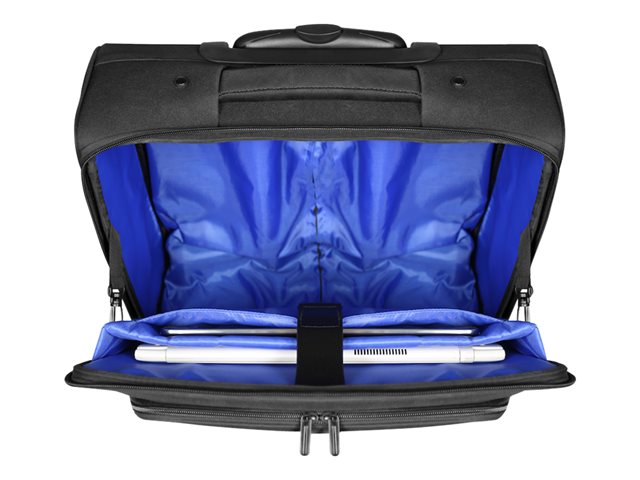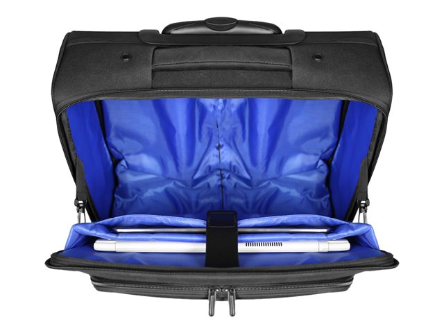 Trolley pour ordinateur portable avec compartiment pour ordinateur portable 15,6" et tablette 10''. Idéal pour les déplacements avec son compartiment pour vêtements et les articles personnels. Poche avant organiser pour stylos et divers accessoires. La structure rigide du trolley protège efficacement son contenu des chocs et chutes. Transport facilité avec son bras extensible en aluminium et poignée à main intégrée. Format IATA adapté aux transports aériens.