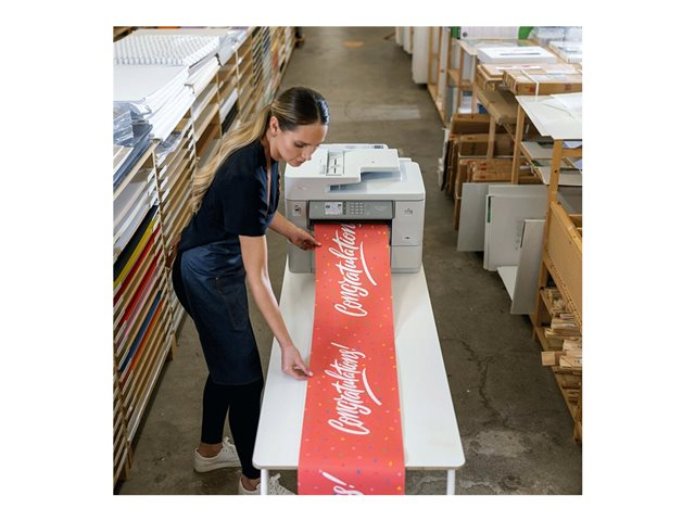 La MFC-J6959DW offre une impression et une numérisation A3 et A4 de qualité supérieure avec la possibilité d'imprimer sur du papier en rouleau. Imprimez facilement des bannières, des affiches, des photos panoramiques et des affiches promotionnelles, puis coupez-les à la longueur requise avec le cutter automatique.